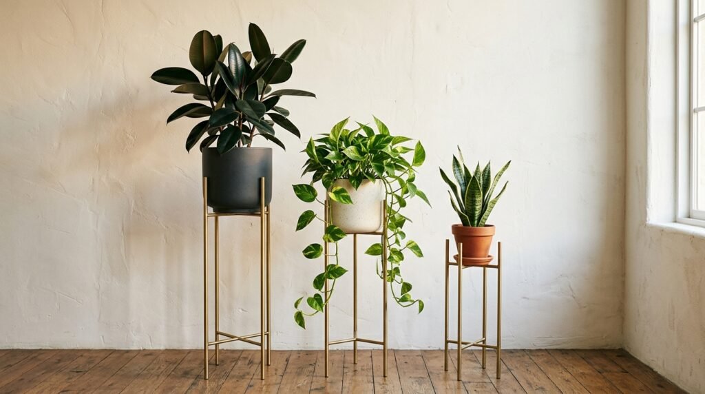 Then there are metallic stands — a personal favorite for good reason. Sleek, modern, and almost universally compatible. A single metallic stand with a rubber plant reads as intentional and contemporary. Three of them, each holding something different, creates a layered display that looks like it was styled by someone who actually knows what they’re doing. Because it was.