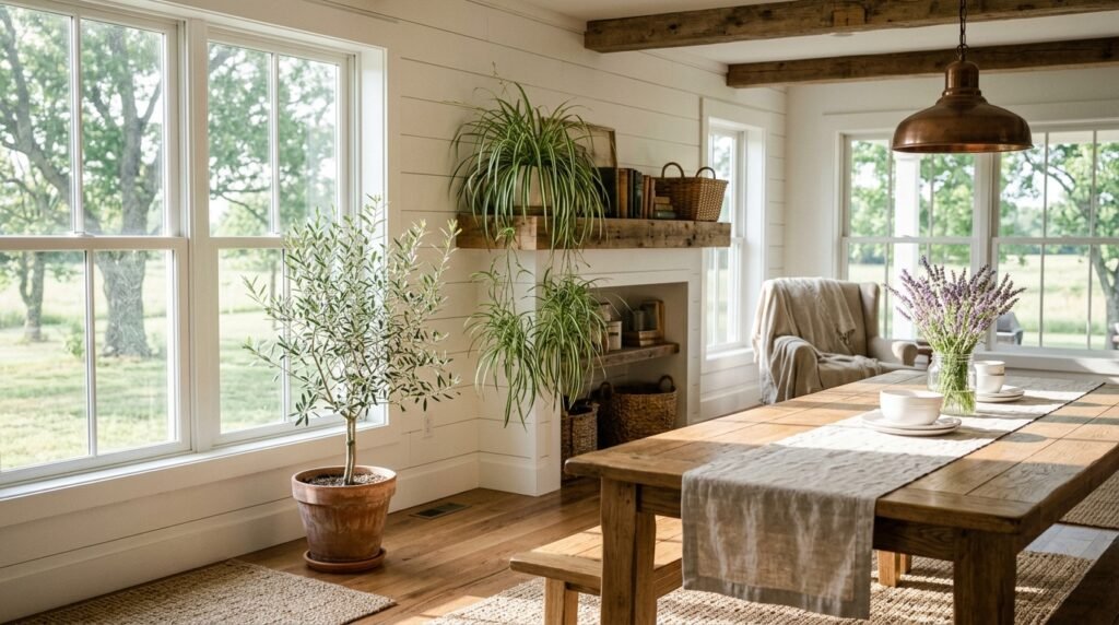 Modern farmhouse is warm, grounded, and a little nostalgic — shiplap walls, natural wood, linen textures. The plant choices should feel like they belong on a sun-drenched windowsill or a big farmhouse table.