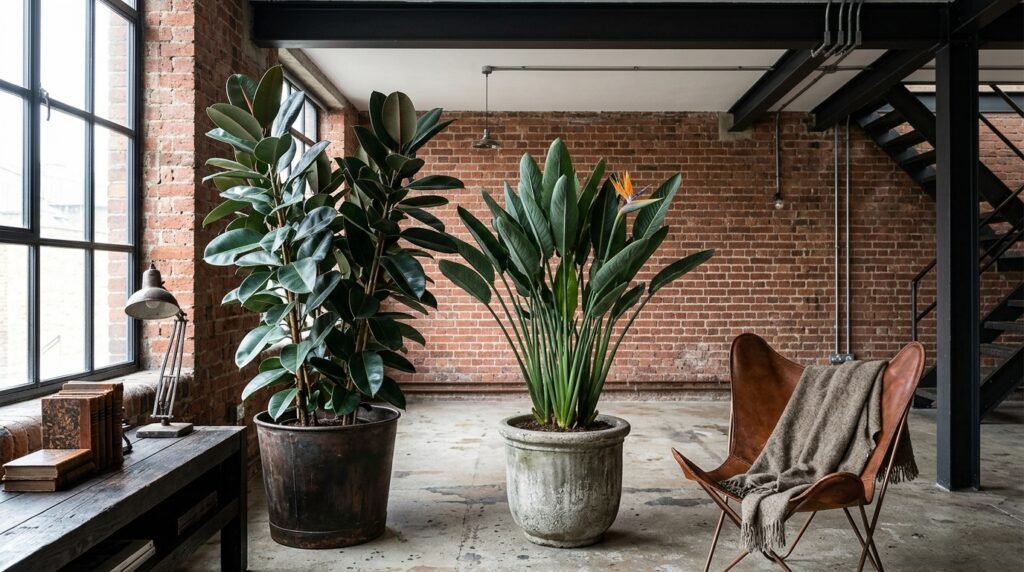 Rubber plants and bird of paradise both bring strong architectural presence. Their bold forms hold their own against hard surfaces. The rubber plant especially — with its deep, glossy leaves — has a graphic quality that complements industrial palettes beautifully. These aren’t delicate plants and they don’t feel delicate. That’s the point.
