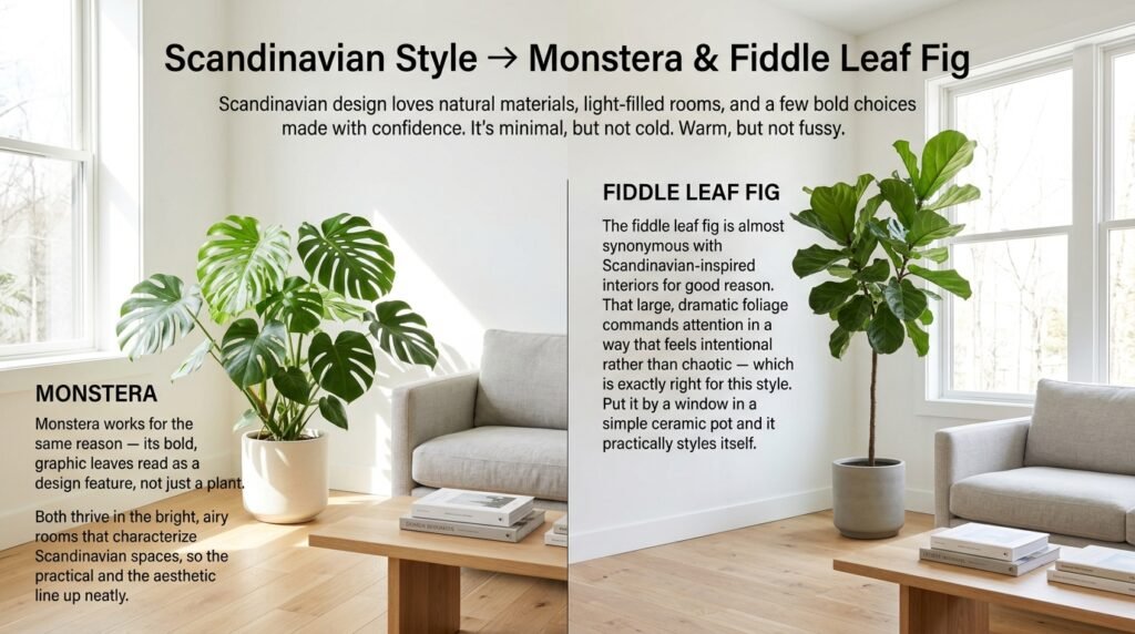 Monstera works for the same reason — its bold, graphic leaves read as a design feature, not just a plant. Both thrive in the bright, airy rooms that characterize Scandinavian spaces, so the practical and the aesthetic line up neatly.